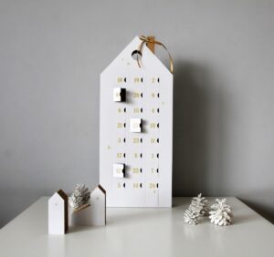 Nechcete dětem kupovat klasické čokoládové kalendáře v supermarketu, ale raději byste jim malé dárečky vymysleli sami? Pak už vám chybí jen adventní domeček od Unlimited Design. Má 24 okýnek a je jen na vás, co do nich dětem nadělíte. Na výběr máte bílý s červenými, zlatými a stříbrnými čísly nebo domeček potištěný tabulovou černí, na který si čísla můžete dopsat sami.