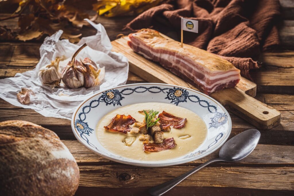 Krémové polévky zažívají každoročně na podzim velký boom. Aby taky ne! Pořádná porce husté polévky pohladí na duši a prohřeje celé tělo. Vyzkoušejte naši česnekovou, která je lehká na přípravu a potřebujete na ni minimum ingrediencí. Chuť zvýrazněte naším tajným esem v rukávu – Lesním špekem – dřevorubeckým bokem speciál od Ing. Michala Šnebergra, který provozuje vlastní uzenářskou řemeslnou výrobnu v Železné Rudě. Výrobky výjimečné kvality navazují na historickou šumavskou výrobu uzenin, vyznačující se výraznou chutí po uzení a trvanlivostí. Produkt Lesní špek – dřevorubecký speciál získal v roce 2021 značku kvality Regionální potravina pro Plzeňský kraj. Více se dozvíte na webu: http://www.reznictvisnebergr.cz/.