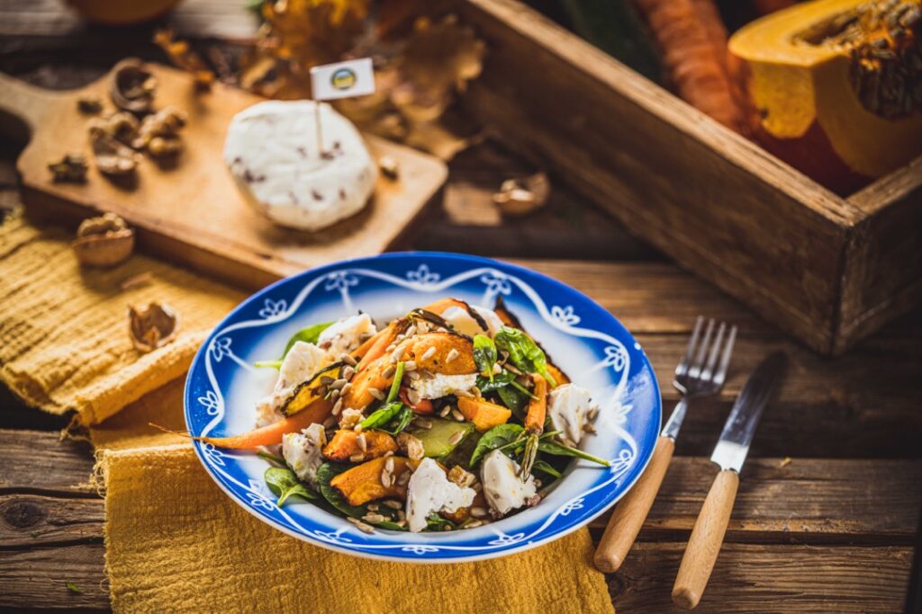 Zvolte v listopadu lehkou variantu večeře nebo oběda, která spolehlivě zažene hlad a navíc výborně chutná. Salát umně kombinuje sezónní zeleninu a lahodný sýr s vlašskými ořechy, který teprve dodá tu správnou chuť celému pokrmu. Sýr pochází z Kryzanovy farmy v jižních Čechách, kde dbají na tradiční postupy a lokální ingredience. Mléko je od jejich krav a oříšky ze zahrady. Vynikající sýr s vlašskými ořechy získal v roce 2021 ocenění Regionální potravina pro Jihočeský kraj. Více informací o Kryzanově farmě i jejích produktech naleznete na: https://www.kryzanovafarma.cz/.