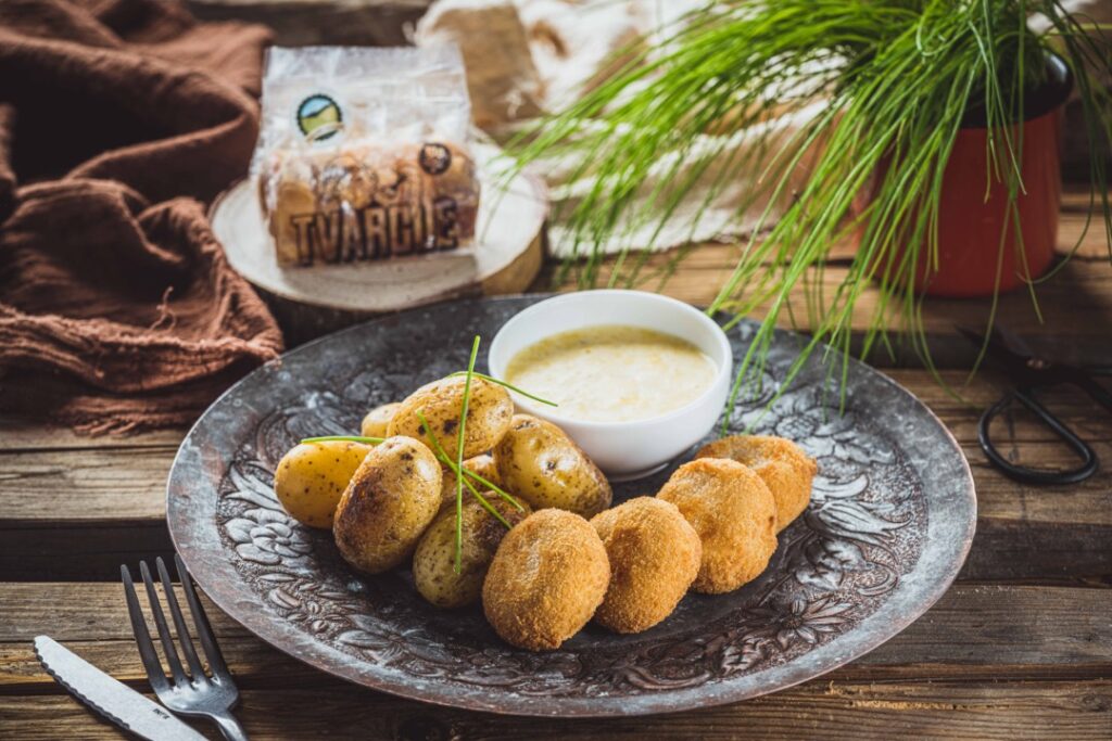 Smažené tvarůžky, opečené mini brambůrky s pažitkou, domácí tatarská omáčka