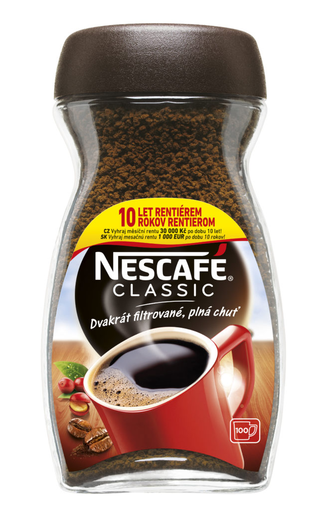 Oblíbené rozpustné kávy NESCAFÉ Classic a NESCAFÉ Classic Crema nyní přichází s unikátní limitovanou soutěžní edicí. Speciální etikety na balení káv přinášejí možnost stát se rentiérem! Výherce si bude moci dopřát bohatší život s měsíční rentou v hodnotě 30 000 Kč po dobu 10 let. Renta výherci zajistí nejen hojnější život, ale také možnost uskutečnit si své životní sny. Soutěž bude oficiálně spuštěna 1. 3. 2020 a končí 30. 6. 2020. Již od února si ovšem spotřebitelé mohou soutěžní balení zakoupit ve vybraných obchodech na území České republiky.