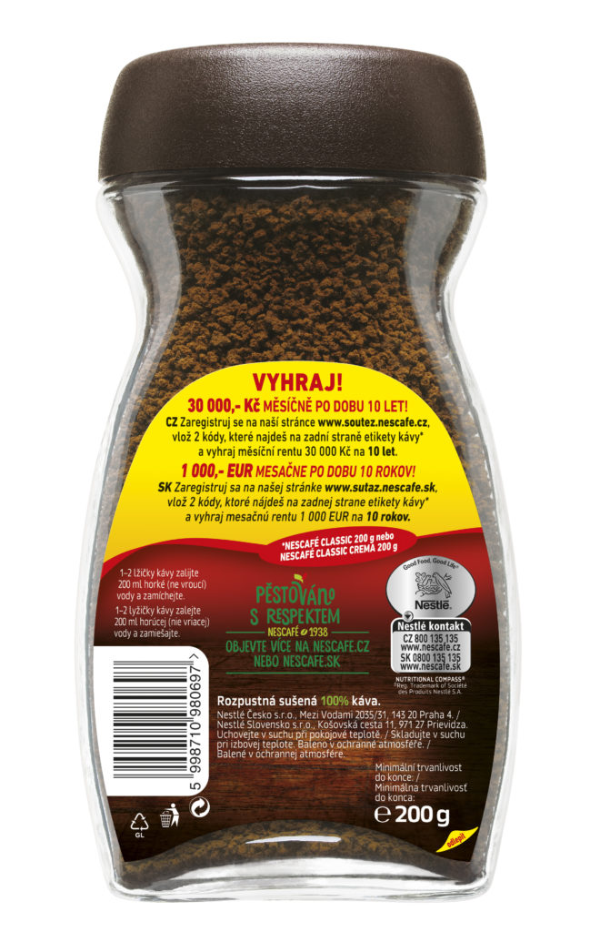 Soutěžní balení NESCAFÉ Classic a NESCAFÉ Classic Crema 200 g jsou k dostání ve vybraných obchodech od února do června 2020 či do vyprodání zásob. Kávy NESCAFÉ jsou kvalitní produkty, což dokazuje program Pěstováno s respektem, jež podporuje udržitelné pěstování kávy a vzdělává farmářské komunity. Více informací o programu naleznete na www.nescafe.cz. Doporučená cena za 200g balení je 209,90 Kč.