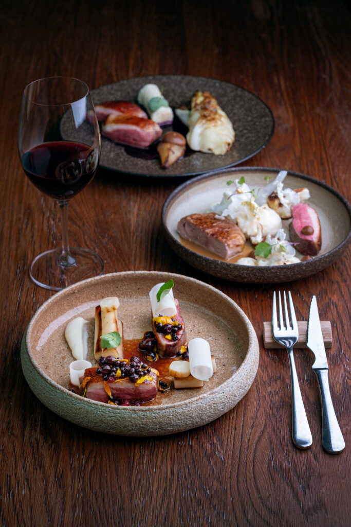 Grilovaná husa na kmínu, černý kořen, hnědé máslo, bobule, jablko