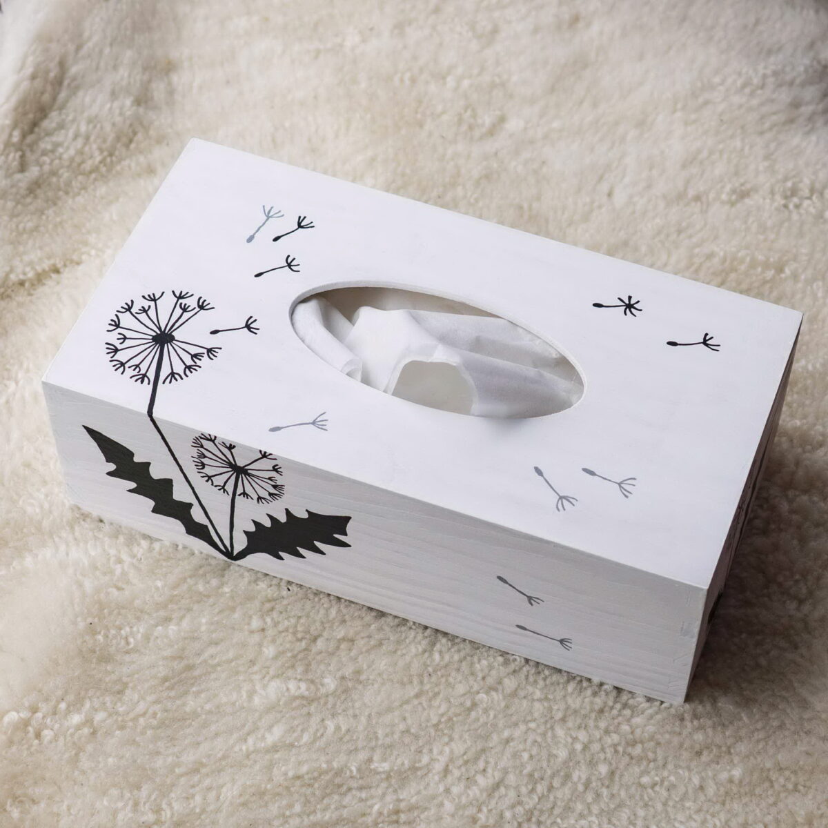 Povrch krabičky by měl být před natíráním zbavený prachu a jiných nečistot. Barvu důkladně rozmíchejte a celou krabičku natřete ve 2 vrstvách s odstupem alespoň 4 hodiny. Vodou ředitelné barvy Balakryl UNI nezapáchají, rychle schnou a jsou ekologické. Proto jsou ideální i pro natírání dekorací v domácnosti. Poté co nátěr důkladně zaschne, můžete krabičku pomalovat vašimi oblíbenými motivy. My jsme ji celou natřeli na bílo a pak ji pomocí Balakrylu v tmavě šedém odstínu ozdobili jemnými motivy odkvetlých pampelišek. A jaký motiv pro svoji krabičku na kapesníky vyberete vy?