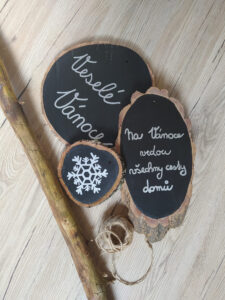 Vánoce jsou hlavně o setkávání. Během svátků přivítáme doma nespočet návštěv, ať už z řad přátel nebo rodinných příslušníků. Potěšte je všechny hned u vchodu milým vánočním přáním na dřevěné kulatině. Na její výrobu budete potřebovat kulatinu, kterou lze sehnat v hobby marketech nebo na internetu, dále Balakryl Tabulovou barvu, bílou křídu nebo akrylový fix, štětec, provázek a větev, na niž hotové vzkazy zavěsíte. Do kulatiny vyvrtejte na okraji otvor na provázek a povrch dřeva zbruste pomocí brusné houbičky. Pak ji po celé ploše natřete černou tabulovou barvou. Poté co nátěr zcela zaschne, můžete černou plochu libovolně popsat či pomalovat křídou nebo akrylovým fixem. Na závěr otvorem v kulatině provlečte provázek a kulatinu zavěste na větev, kterou upevněte na stěně.