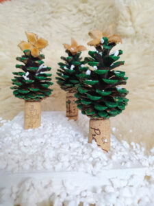 Vypravte se s dětmi do lesa, zapojte je do sběru šišek a bukvic a vyrobte si společně vánoční stromečky, které můžete zapíchnout do květináče nebo sněhu z polystyrenových kuliček. Na jejich výrobu budete kromě šišek a bukvic potřebovat ještě štětec, korkové zátky, zelenou krycí barvu Balakryl UNI a tavnou pistoli. Okraje šišek nejprve natřete nazeleno a nechte přibližně 4 hodiny uschnout. Poté k nim pomocí tavné pistole přilepte zespodu korkovou zátku. Místo hvězdy přilepte na špičku stromku bukvici.