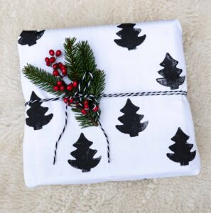 NÁŠ TIP: Na detaily, jako je například sobí nos, můžete použít tenký štětec nebo kosmetickou tyčinku. Do uschlé a vyžehlené látky pak dárky balte stejně jako do papíru, jen zahnuté kraje nepřilepujte lepicí páskou, ale převažte je provázkem nebo stuhou.