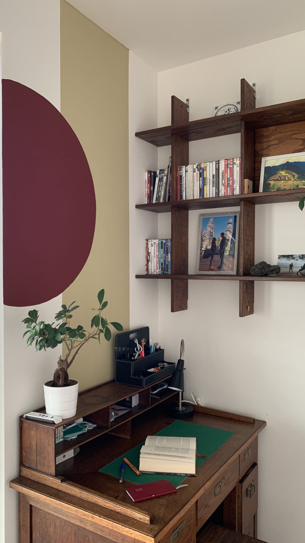 Do pracovního koutu není třeba investovat mnoho peněz ani času. Jako psací stůl poslouží třeba starý dřevěný stůl z bazaru, kterému stačí dát nový ochranný nátěr. A pokud máte doma potřebné nářadí, policový díl si z dřevěných prken dokážete vyrobit i sami. Stěnu za stolem pak můžete oživit nápaditým obrazem či plakátem. Nebo na ni zkuste namalovat barevné geometrické tvary. Tereza Tobiášová se například inspirovala orientem. Pomocí barev Primalex Essence vytvořila uprostřed stěny svého pracovního koutu žlutohnědý pruh, který následně částečně překryla půlkruhem v tmavě červené barvě.